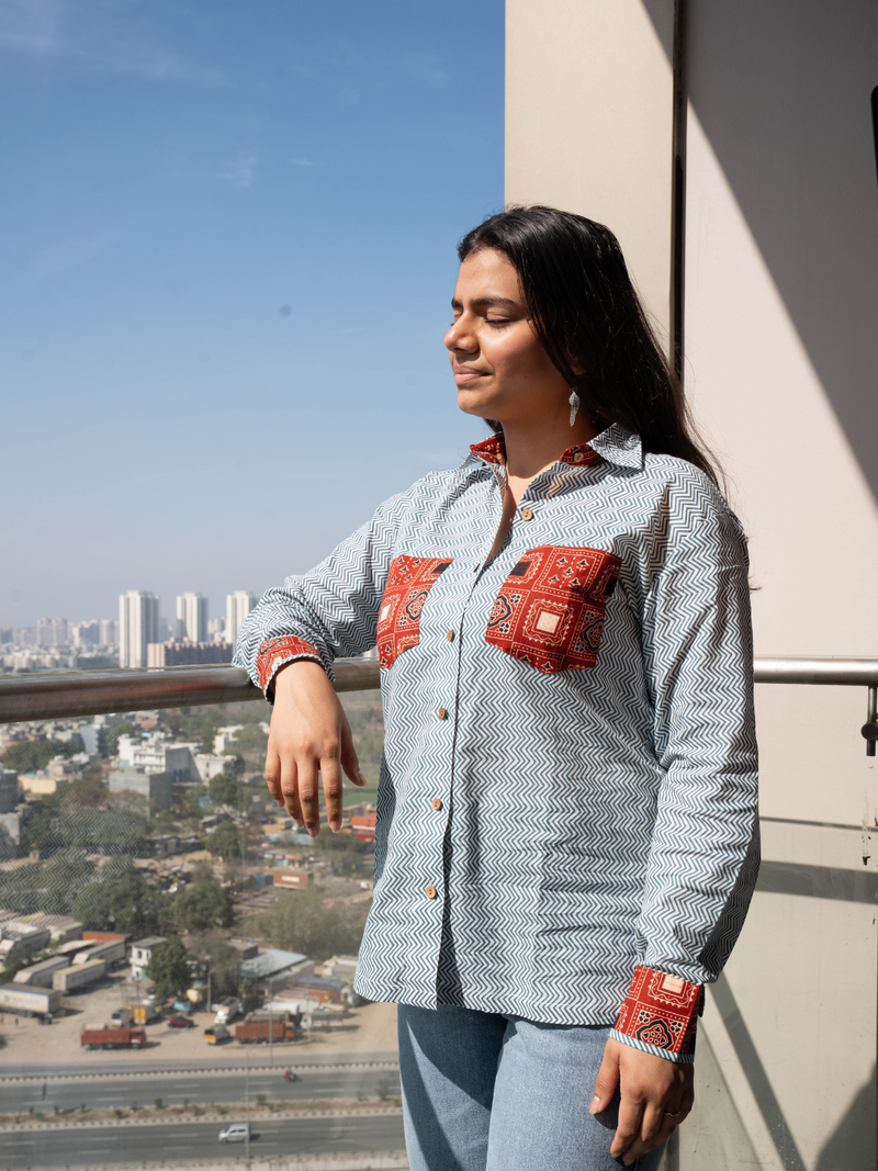 Safed Shukran – our white zigzag shirt with bold red pocket details, perfect for adding a playful twist to your indo-western days.